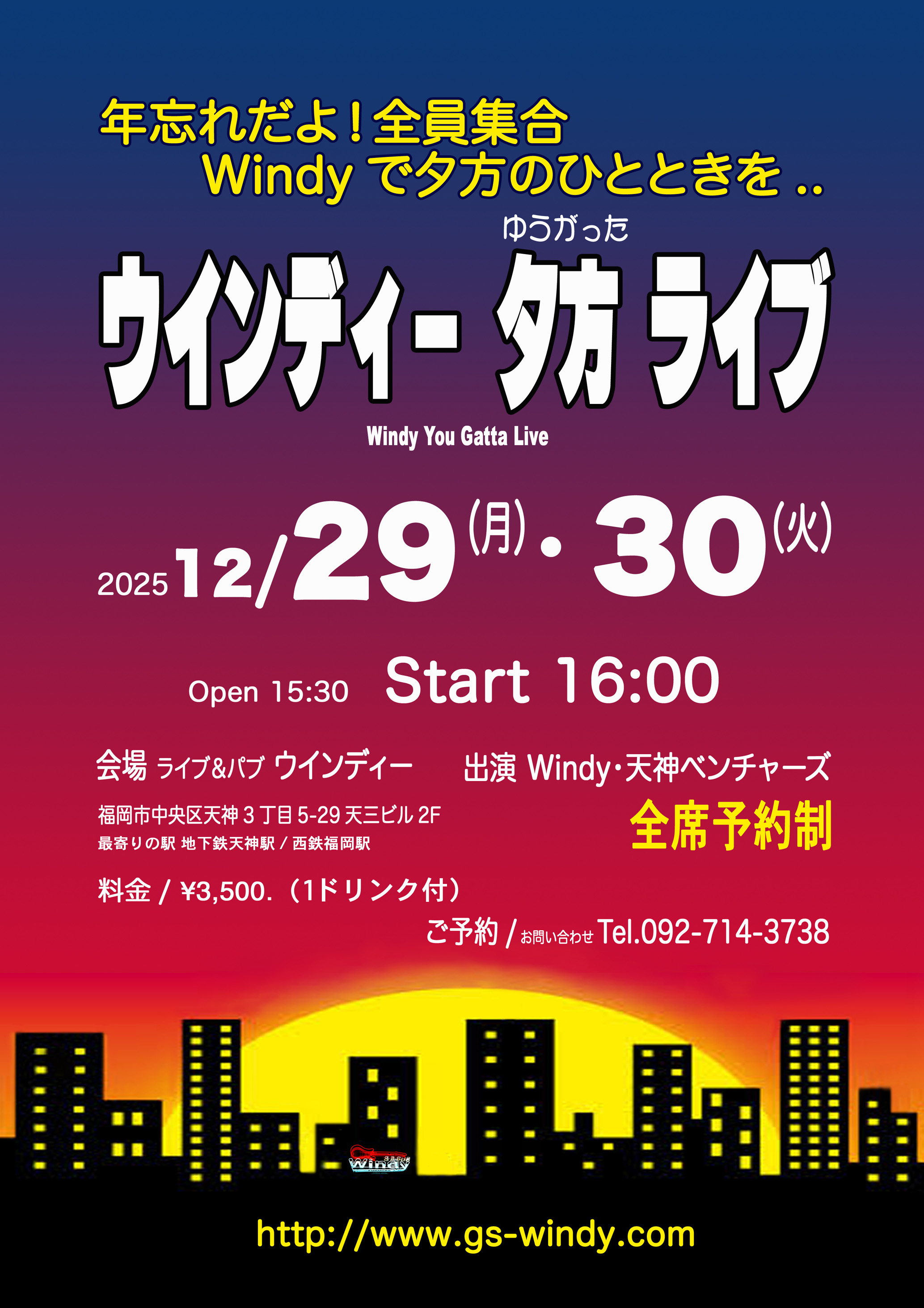 2019年 12月29日(日)満席! 今年もありがとうございました Windyの年末スペシャルライブ ~~~ ウインディー 年末 年忘れ ライブ ~~~ 出演:Windy 会場 Live&Pub Windy (福岡市中央区天神3-5-29 天三ビル2F) 最寄りの駅:地下鉄天神駅/西鉄福岡駅 |